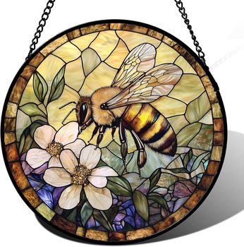 빈티지 꿀벌 노란색 꽃 태양 포수 11.8 "스테인드 글라스 창 매달려 가정 장식 어머니의 날 생일 선물 여성을위한